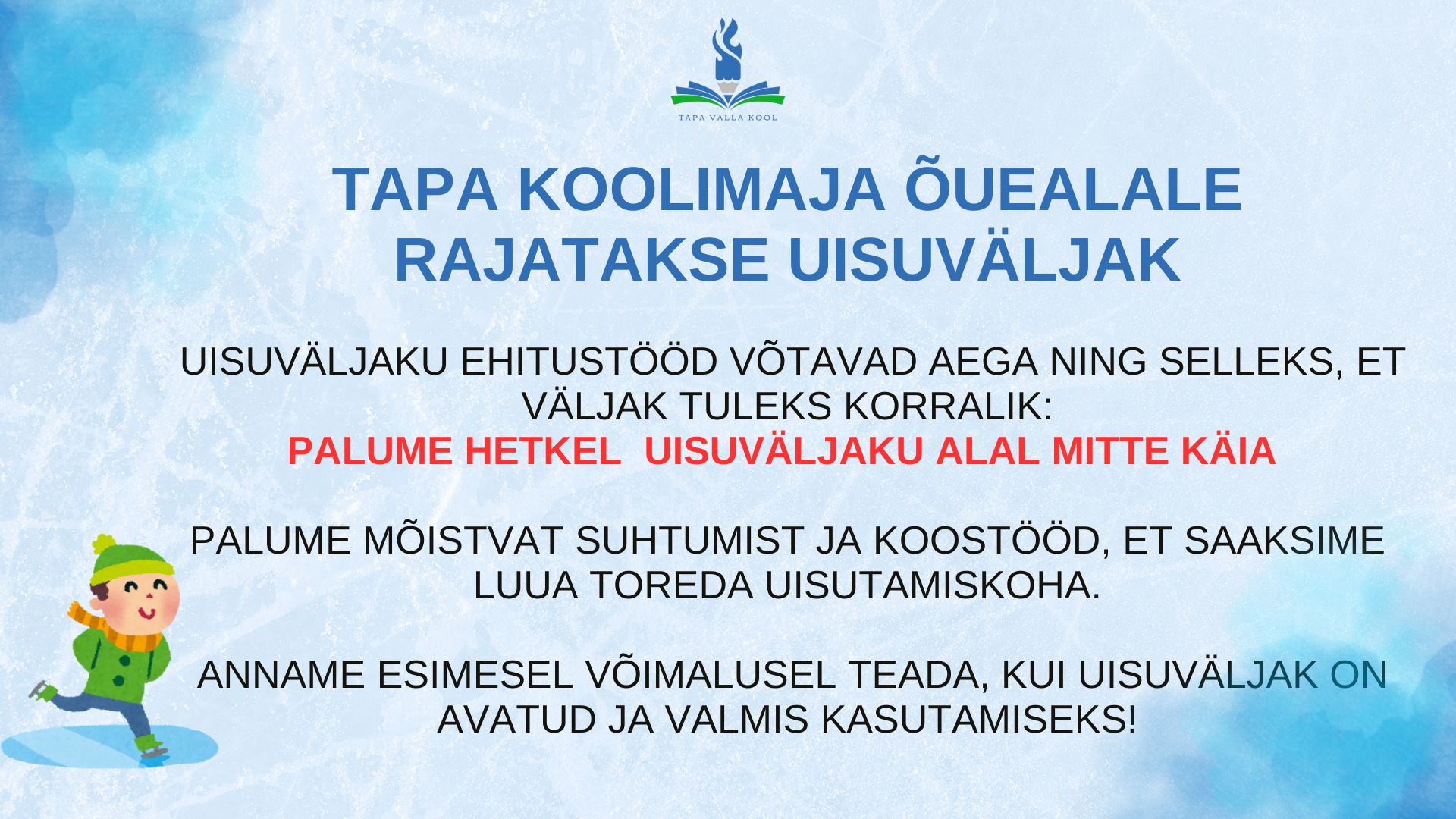 Meil on hea meel teatada, et Tapa õppekoha (Pargi 12) õuealale rajatakse uisuväljak! ![]()